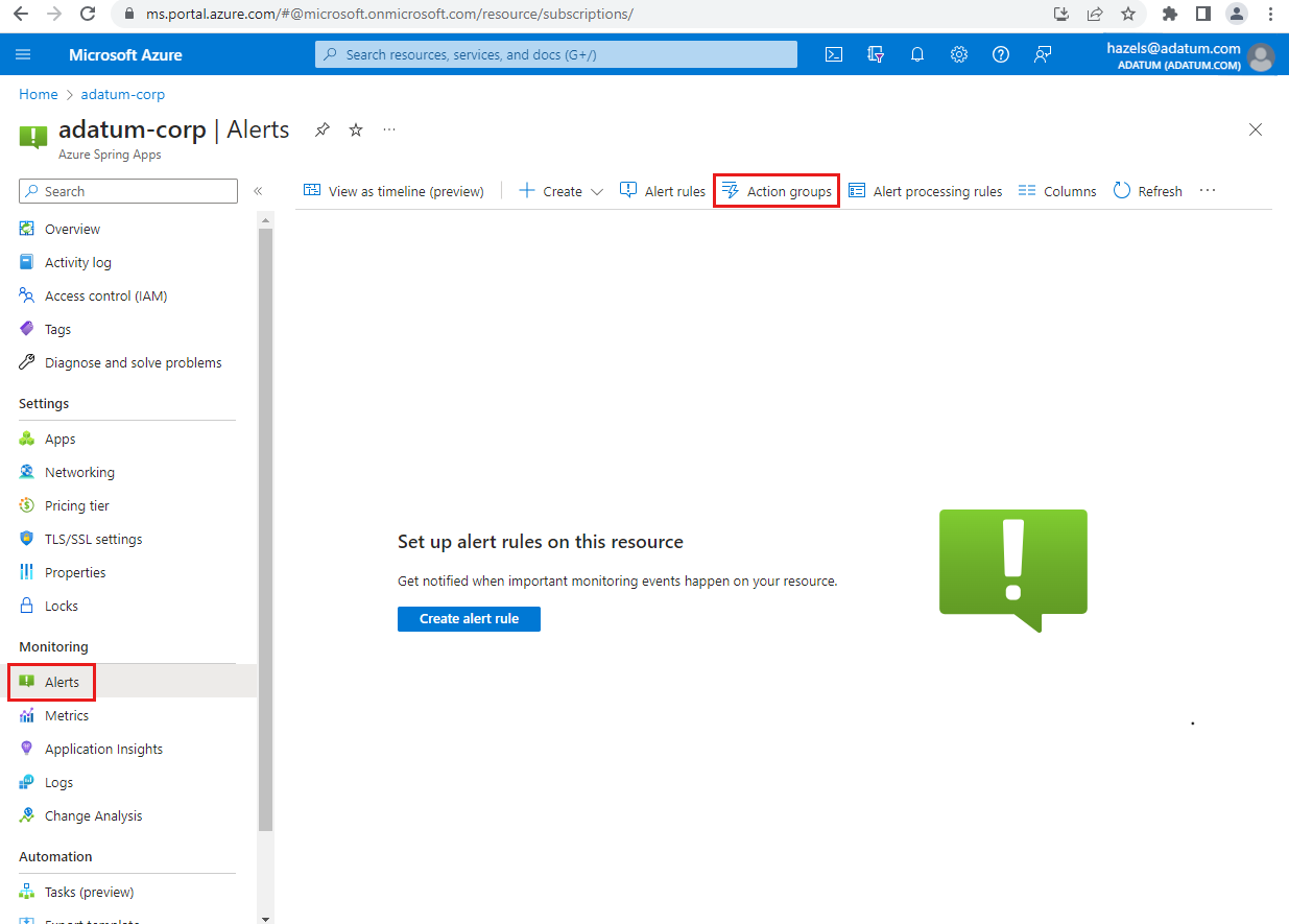 本文介绍了如何为 Azure Spring Apps 中的应用程序设置警报和操作组。 若要详细了解操作组,请参阅: