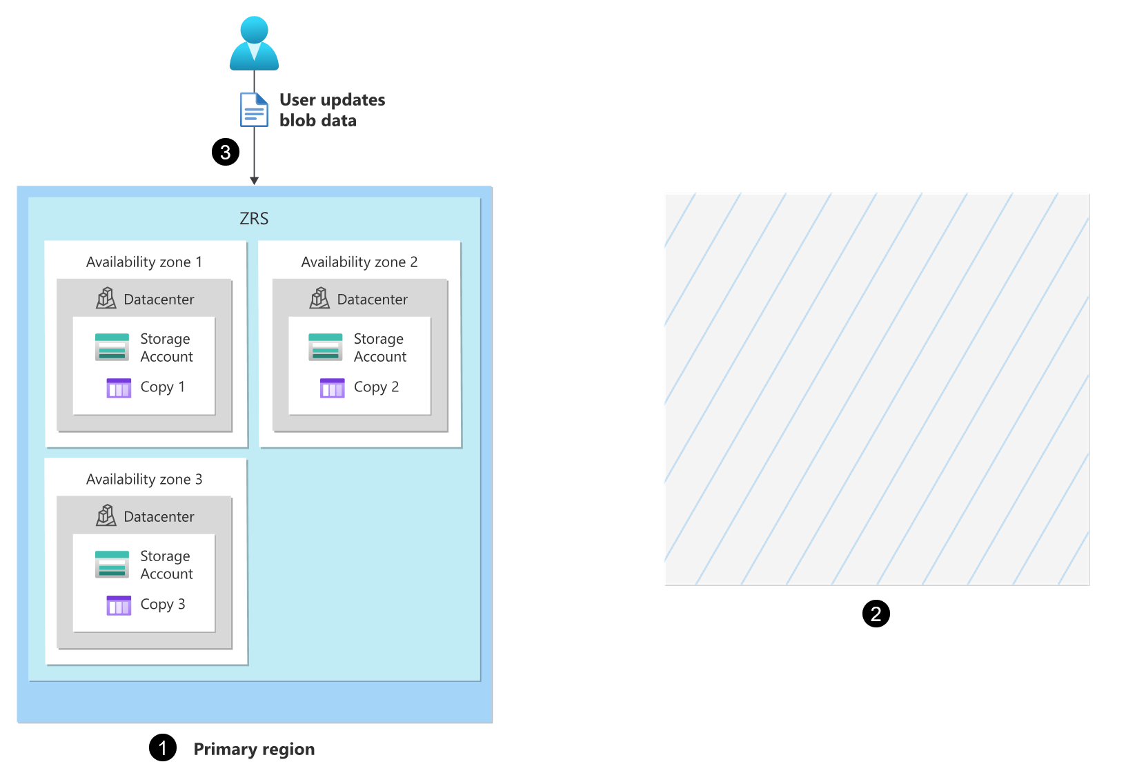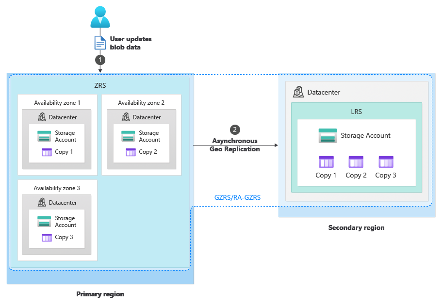 当存储帐户配置为异地区域冗余存储 (GZRS) 或读取访问异地区域冗余存储 (RA-GZRS) 复制时,区域冗余存储 (ZRS) 主要区域中的数据是区域冗余的,并在 LRS 次要区域内复制三次。 如果帐户配置为读取访问 (RA),则只要该区域的存储服务终结点可用,就可以从次要区域读取数据。