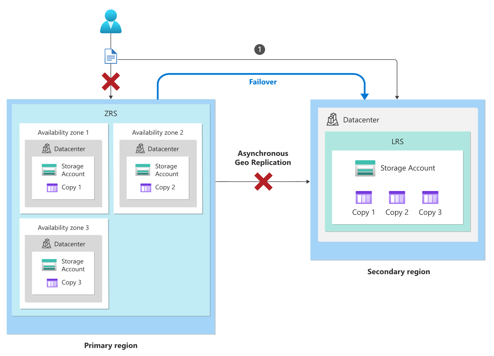 如果主要区域的存储服务终结点不可用,客户管理的计划外故障转移使你能够将整个异地冗余存储帐户故障转移到次要区域。 在故障转移期间,原始次要区域将成为新的主要区域。 然后,所有存储服务终结点都会重定向到新的主要区域。 解决存储服务终结点中断问题后,可以再执行一次故障转移操作,故障回复到原始主要区域。
