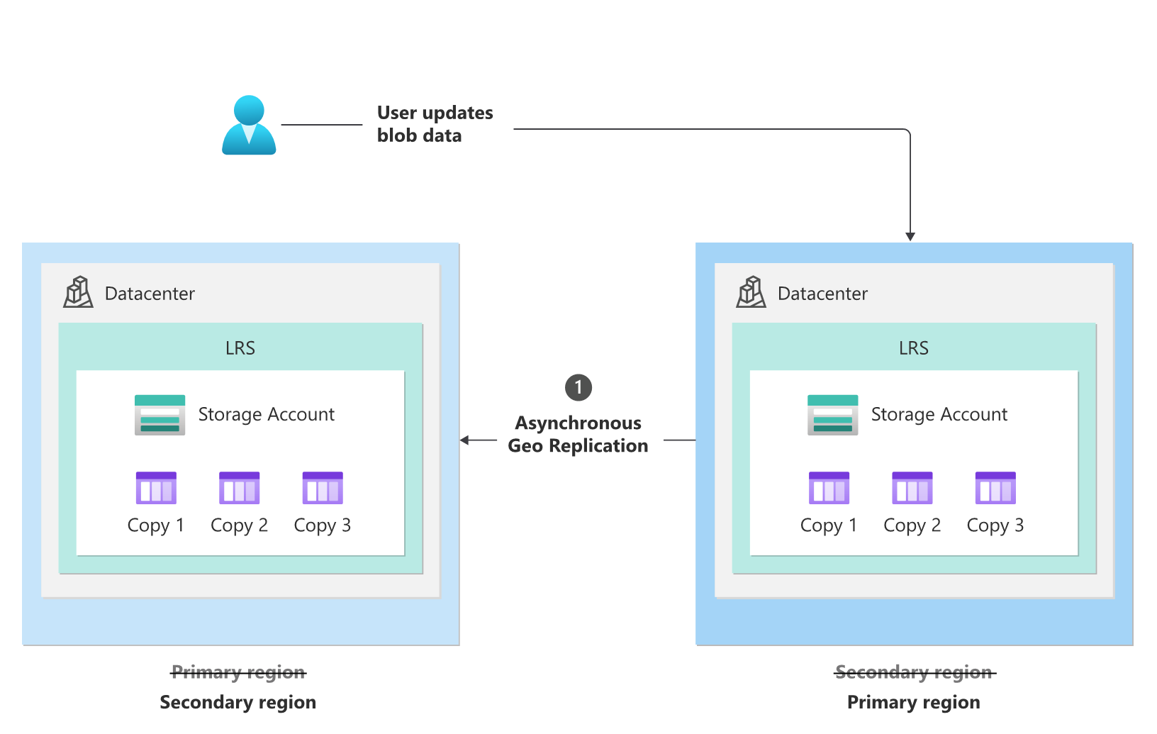 将帐户重新配置为利用 GRS 后,Azure 将开始以异步方式将数据复制到新的次要区域 (1),如下图所示:
