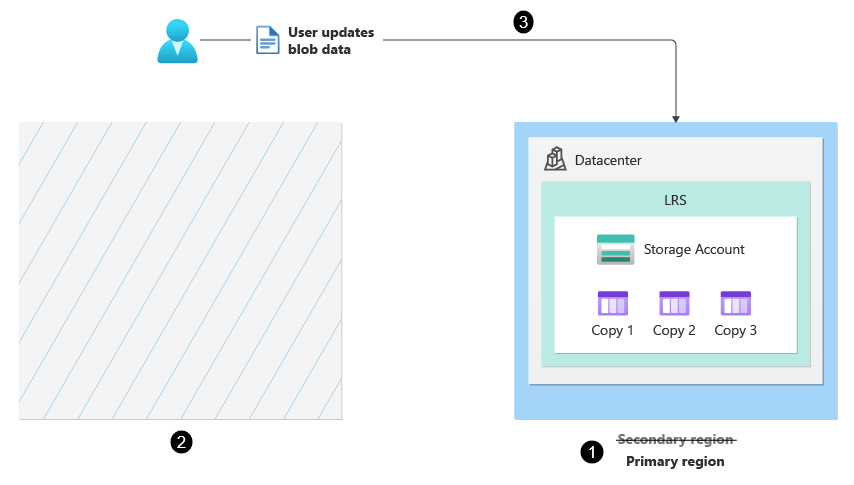 故障转移完成后,原始次要区域将成为新的主要区域 (1),原始主要区域中存储帐户的副本将被删除 (2)。 存储帐户在新主要区域中配置为 LRS,并且不再具备地理冗余。 用户可以继续将数据写入存储帐户 (3),如下图所示: