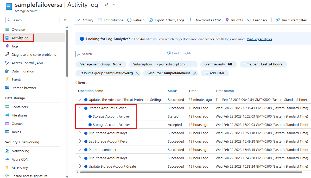 若要查看故障转移的详细状态,请在通知中的 活动日志链接中选择“更多事件 ”,或转到存储帐户的活动 日志 页: