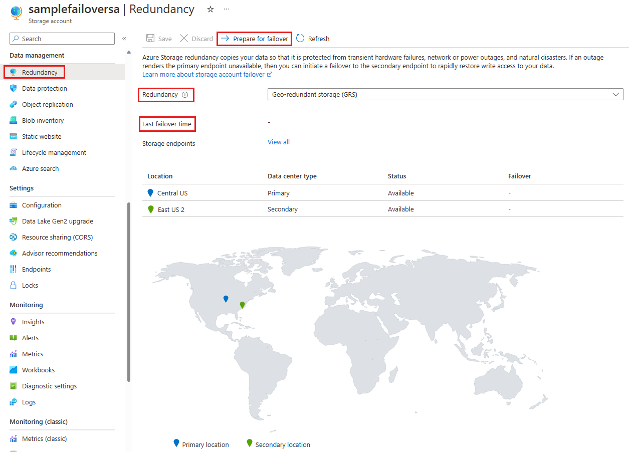 从数据管理组中选择冗余。 下图显示了存储帐户的异地冗余配置和故障转移状态。