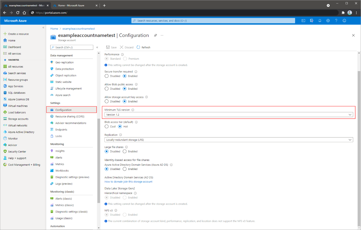 通过 Azure 门户创建存储帐户时,默认情况下,最低 TLS 版本设置为 1.2。