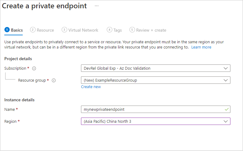 在“基本信息”面板中,为专用终端选择所需的订阅、资源组、名称和区域。 资源组、名称和区域可以随意配置,不需要与存储帐户匹配,但必须在与您希望创建专用终结点的虚拟网络相同的区域中创建该专用终结点。 然后选择“下一步: 资源”。