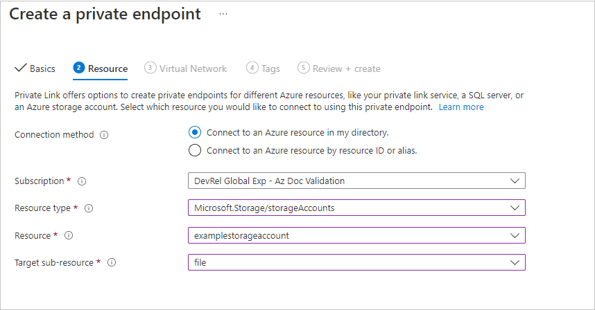 在“资源”边栏中,为目标子资源选择“文件”。 然后选择“下一步: 虚拟网络”。