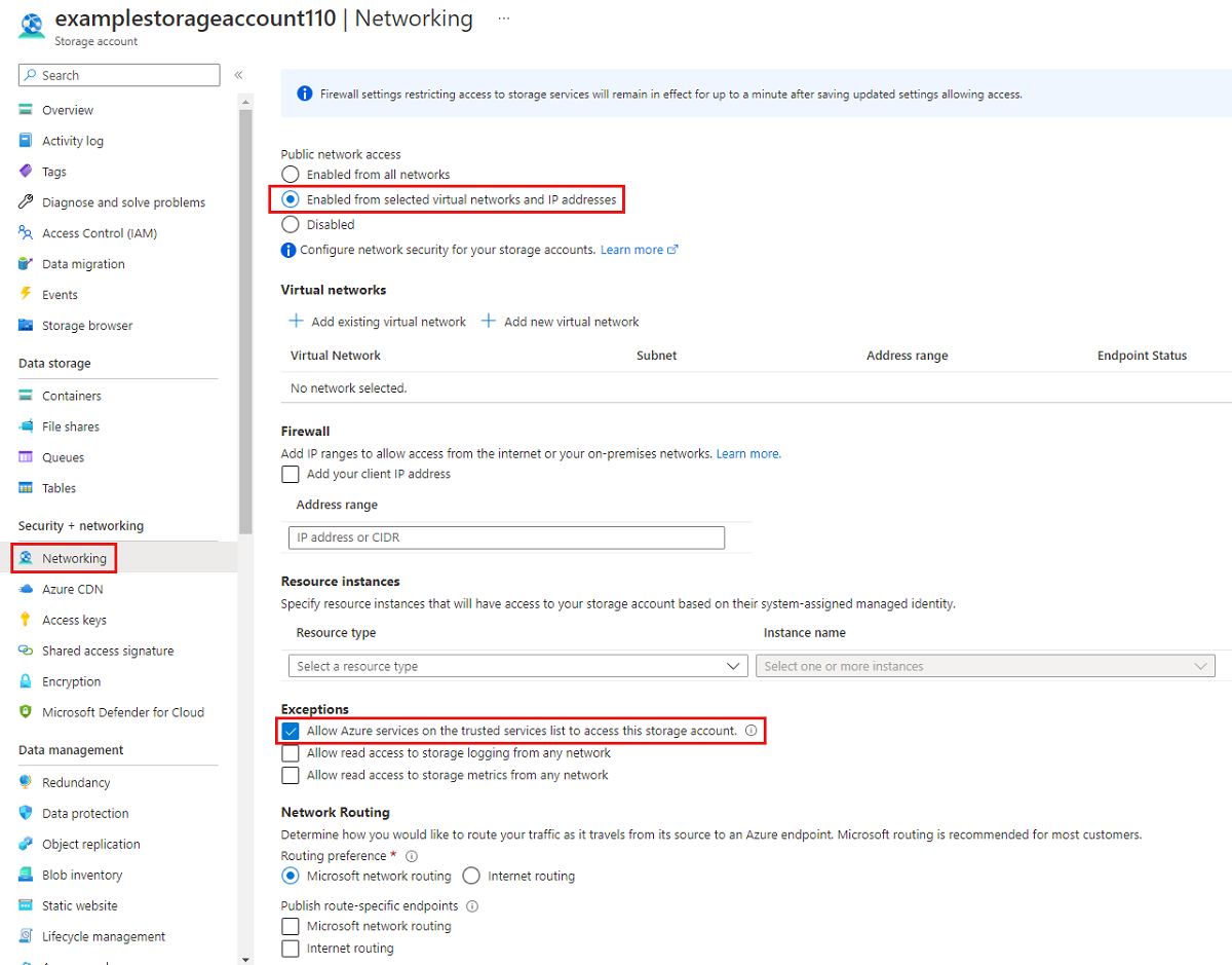 存储帐户的公共终结点已被启用。 有关详细信息,请参阅授予对受信任的 Azure 服务的访问权限并禁用对存储帐户公共终结点的访问权限。 |