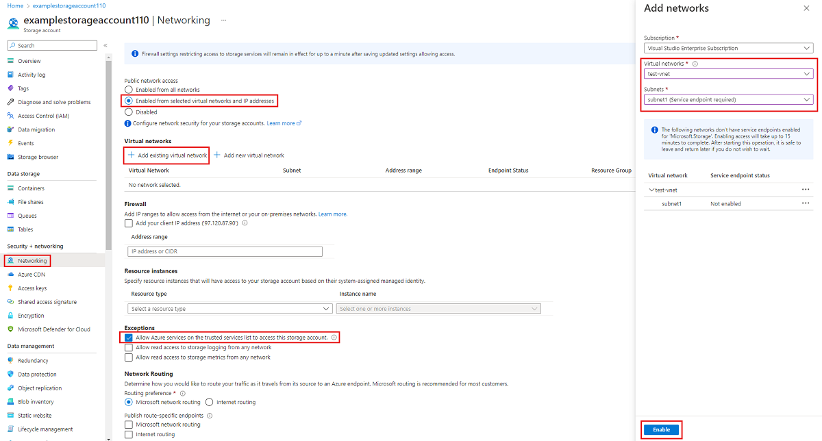 在页面顶部,选择“从选定的虚拟网络和 IP 地址启用”单选按钮。 随后会显示一些用于控制公共终结点限制的设置。 选择“+添加现有虚拟网络”,以选择应允许其通过公共终结点访问存储帐户的特定虚拟网络。 选择虚拟网络并为该虚拟网络选择子网,然后选择“启用”。