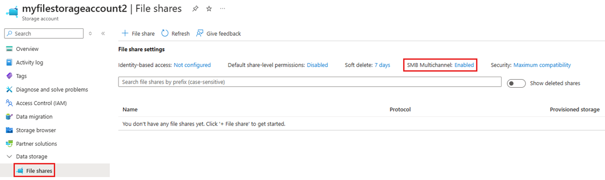若要查看 SMB 多通道的状态,请导航到包含 SSD 文件共享的存储帐户,并在存储帐户目录的数据存储标题下选择文件共享。 应在 “文件共享设置” 部分下看到 SMB 多通道的状态。 如果未看到,请确保存储帐户是 FileStorage 帐户类型。