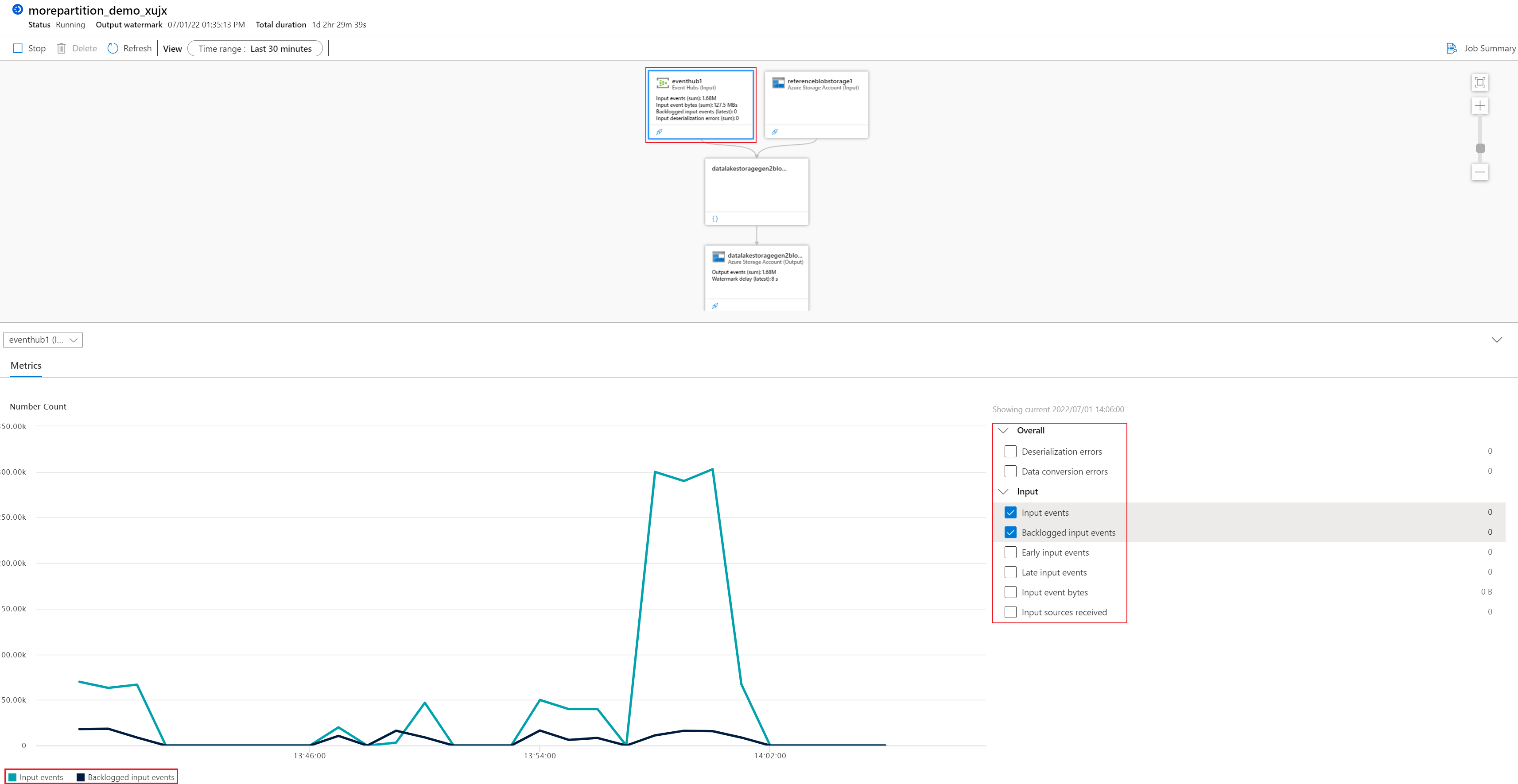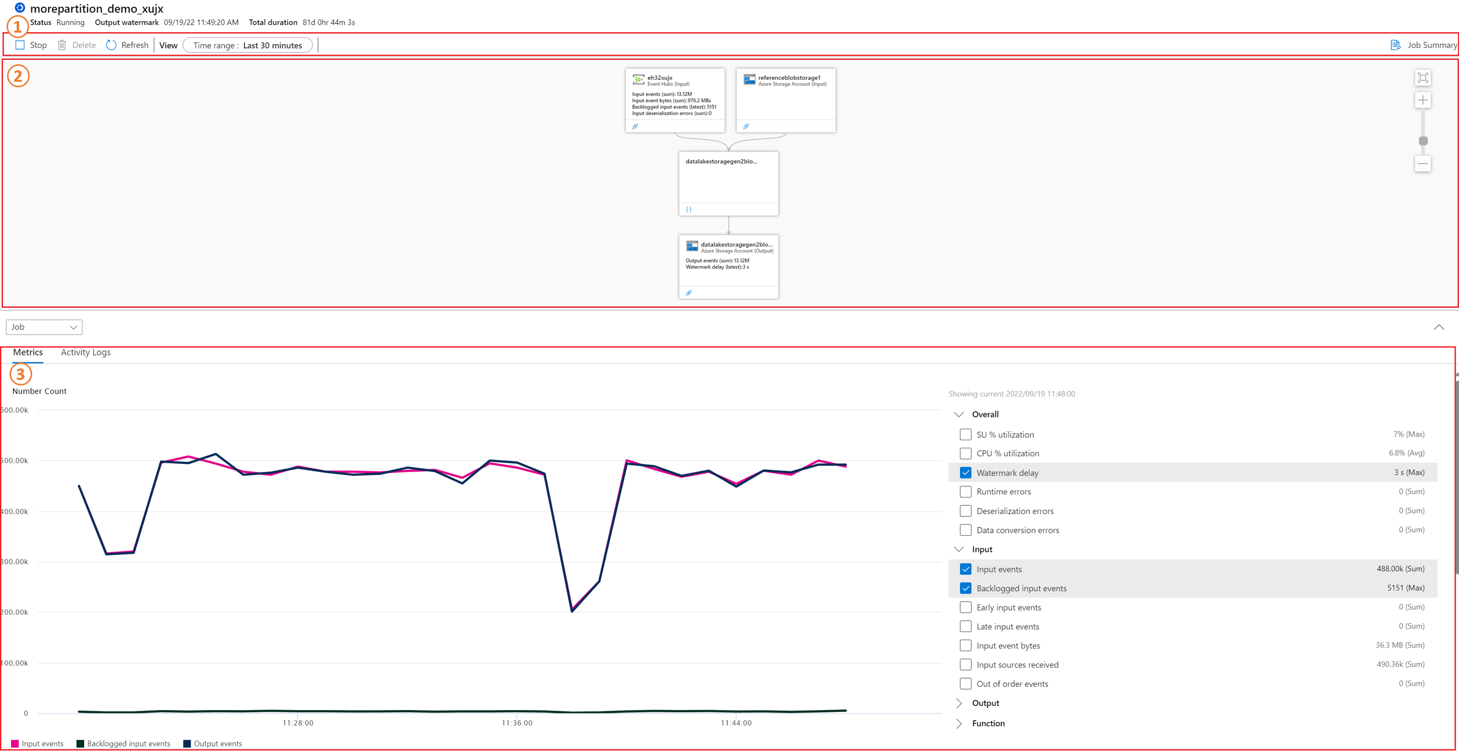 关系图部分:此部分中的节点框表示作业的输入、输出和查询步骤。 可以直接查看节点中的指标,或通过单击本部分中的特定节点在图表部分中以交互方式查看其指标。 有关指标定义的详细信息,请参阅 Azure 流分析节点名称维度。