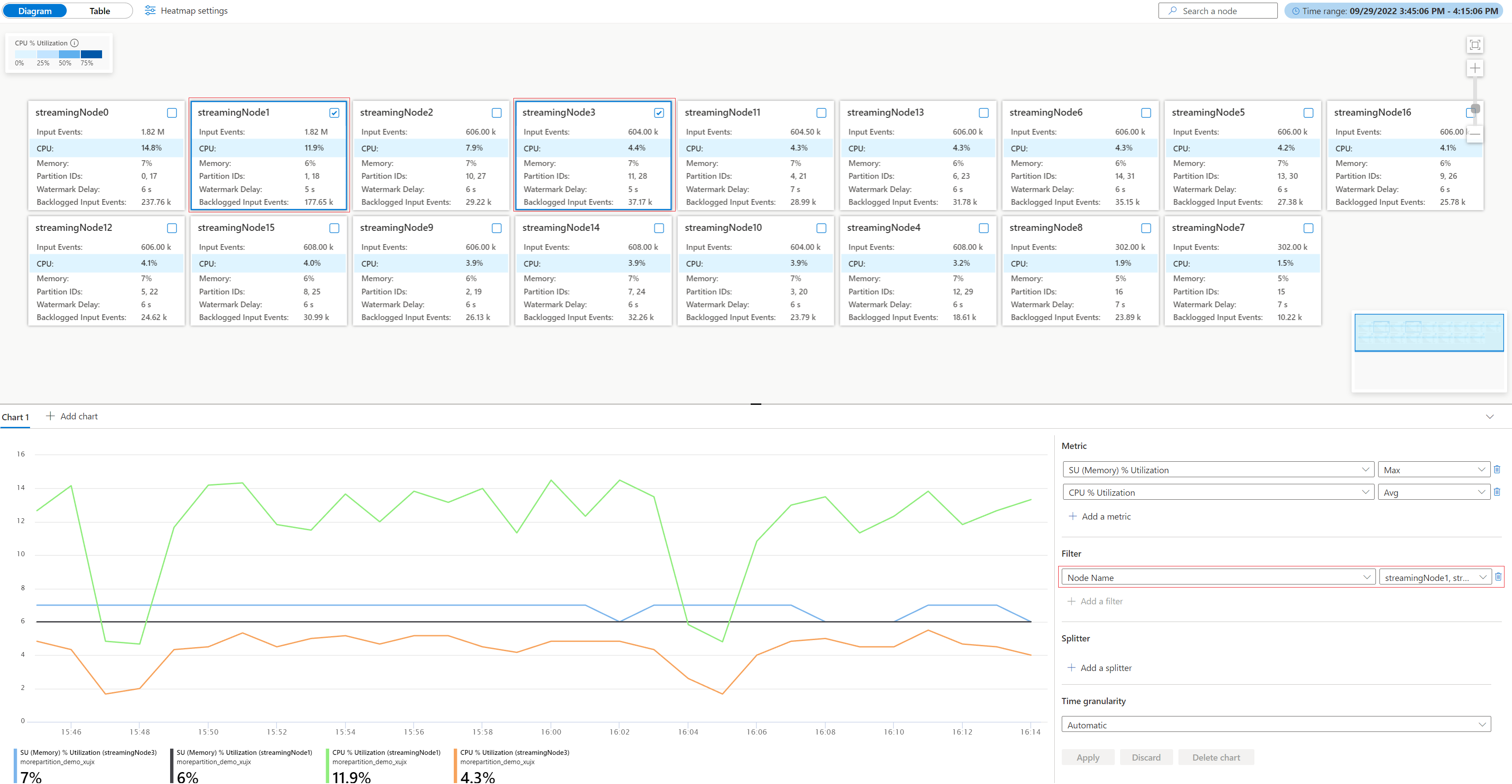 关系图/表部分:可在其中使用关系图视图或表视图查看流式处理节点级别的指标(所选时间范围中的聚合指标)。 本部分中的每个框都表示一个用于处理输入数据的流式处理节点。 每个节点上的指标包括: