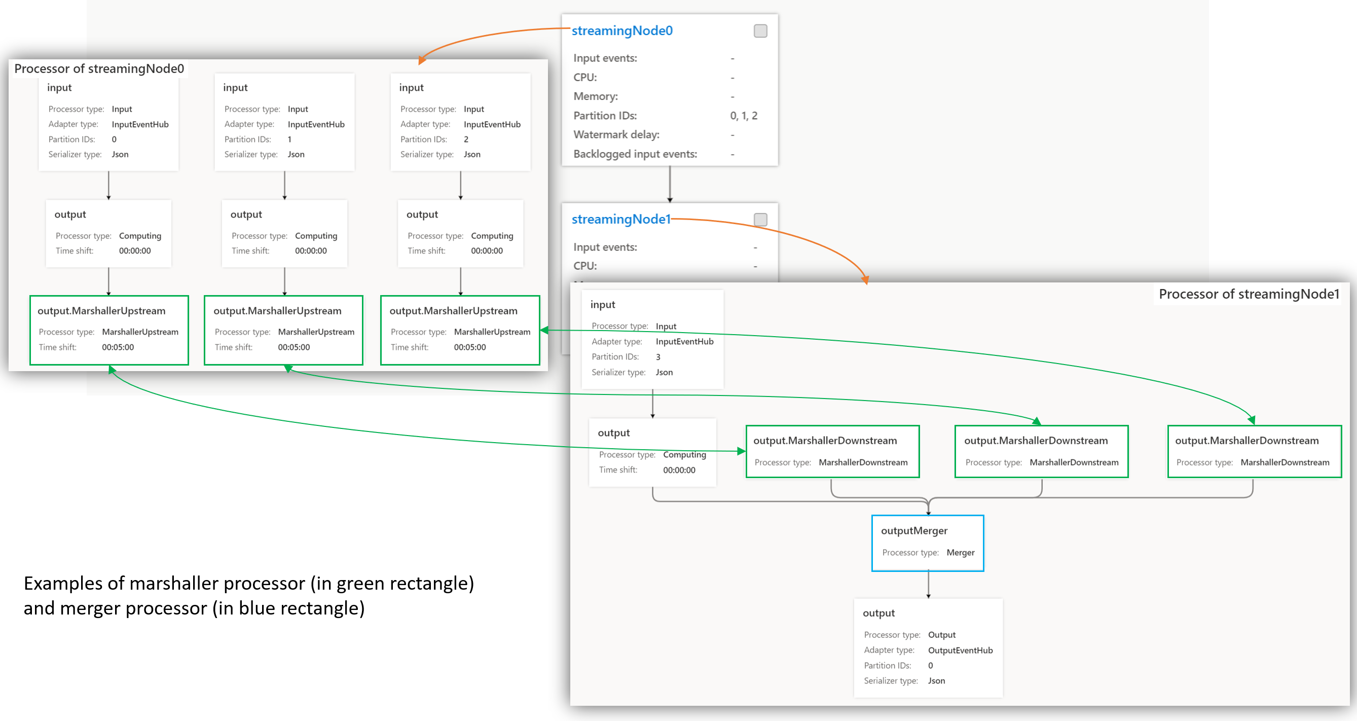 处理器类型 说明 “输入”或“输出” 此处理器用于读取输入或写入输出数据流。 ReferenceData 此处理器用于提取引用数据。 计算 此处理器用于根据查询逻辑处理流数据,例如聚合、筛选、使用窗口进行分组等。 要了解有关流数据计算查询函数的更多信息,请参阅 Azure 流分析查询语言参考。 MarshallerUpstream 和 MarshallerDownstream 当流节点之间存在流数据交互时,将有两个封送程序处理器:1). MarshallerUpstream,用于在上游流节点中发送数据,2). MarshallerDownstream,用于接收下游流节点中的数据。 合并 此处理器用于接收从多个上游流节点输出的跨分区流数据。 优化作业性能的最佳做法是更新查询以删除合并处理器,让作业并行运行,因为合并处理器是作业的瓶颈。 适配器类型:显示输入或输出适配器的类型。 流分析支持各种输入源和输出目标。 每个输入源或输出目标都有一个专用的适配器类型。 仅输入处理器和输出处理器中提供适配器类型。 例如,“InputBlob”表示输入处理器从中接收数据的 ADLS Gen2 输入;“OutputDocumentDb”表示输出处理器将数据输出到的 Cosmos DB 输出。