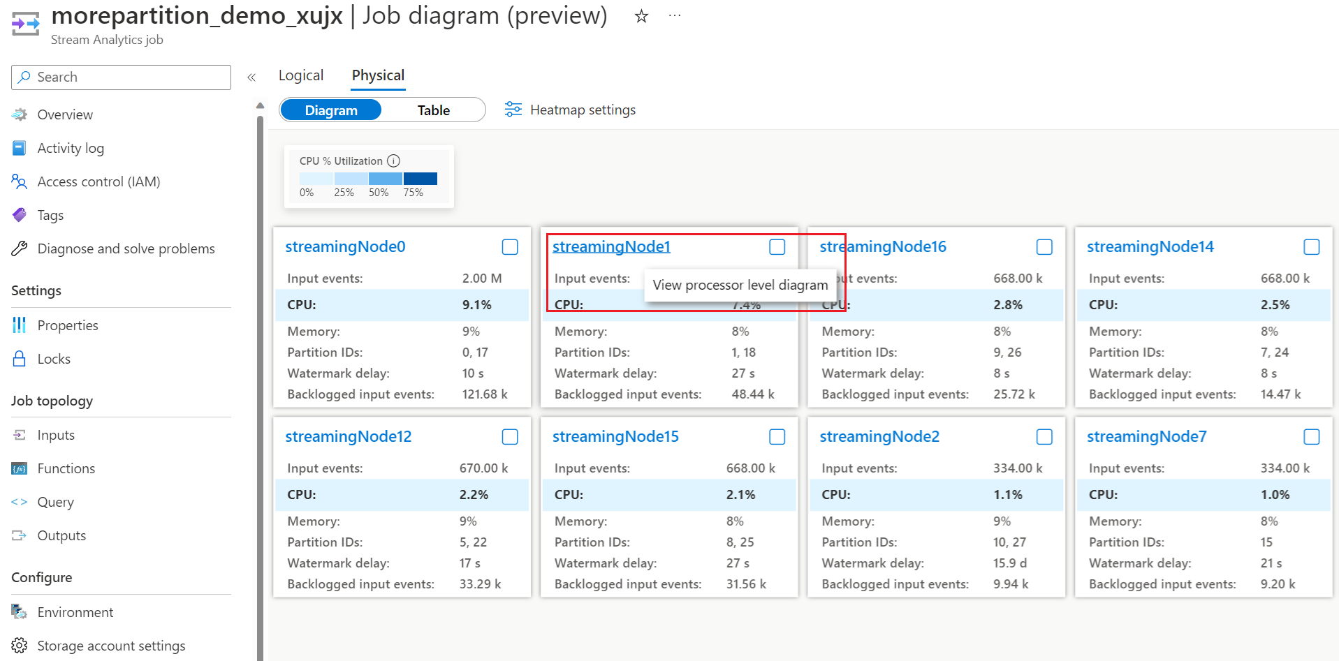 物理关系图:它使用物理计算概念可视化流分析作业的关键指标:流式处理节点维度。 流式处理节点表示一组用于处理作业的输入数据的计算资源。 若要更详细地了解流式处理节点维度,请参阅 Azure 流分析节点名称维度。
