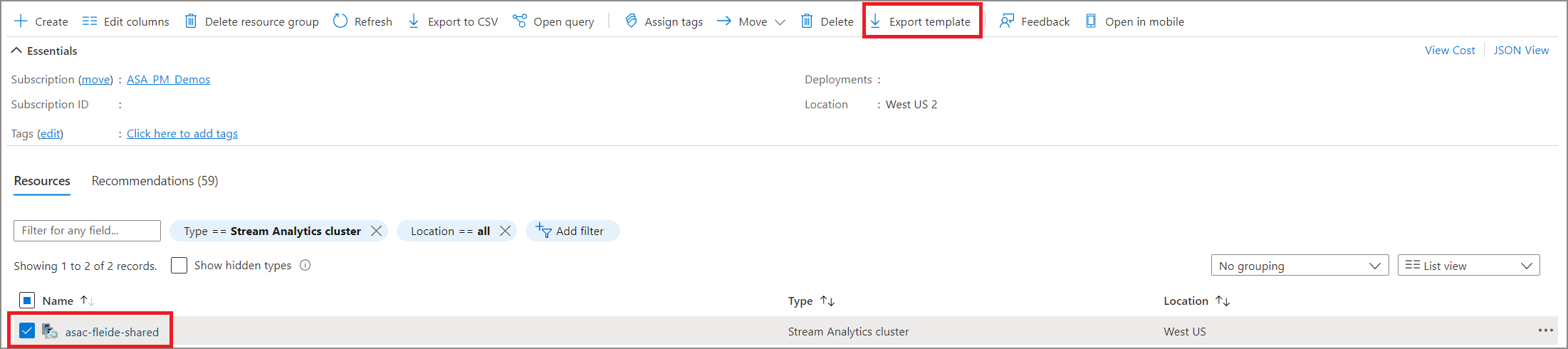 选择要移动的Azure流分析资源,然后单击Export 模板。
