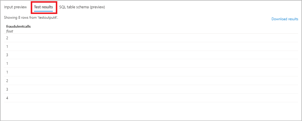 选择“作业拓扑”下的“查询”,然后使用查询中的别名将输出写入上一步骤中提供的表名中。 单击“测试查询”以测试查询逻辑,并查看“测试结果”,结果中显示了将由作业生成的输出的架构。 注意:要测试查询,需要在输入源中具有传入流数据,或者能够将示例数据上传到测试查询中。 可以通过测试流分析查询了解详细信息。