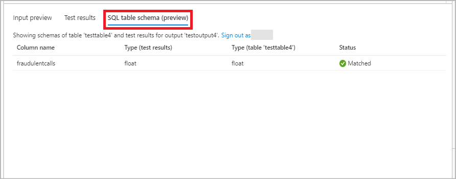 单击“SQL 表架构”以查看列名和类型。 单击“创建表”,SQL 数据库中即会创建表。