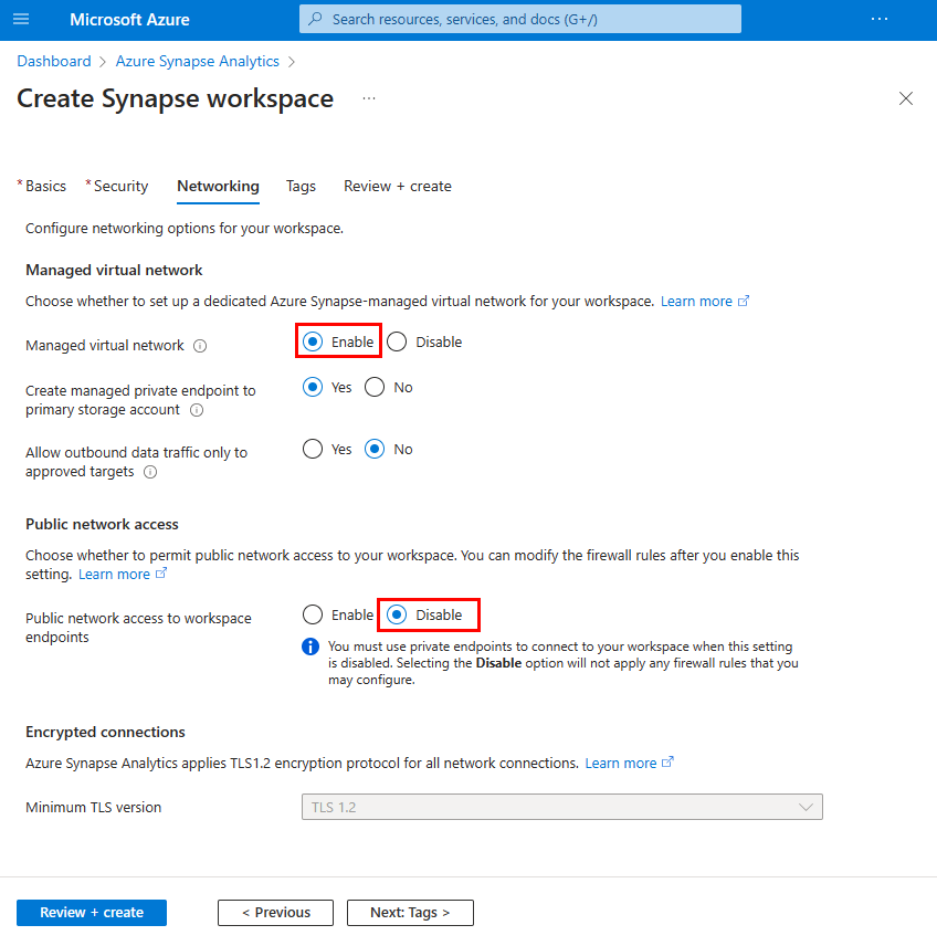 在“托管虚拟网络”下,选择“启用”以将工作区与托管虚拟网络关联,并允许进行公用网络访问。
