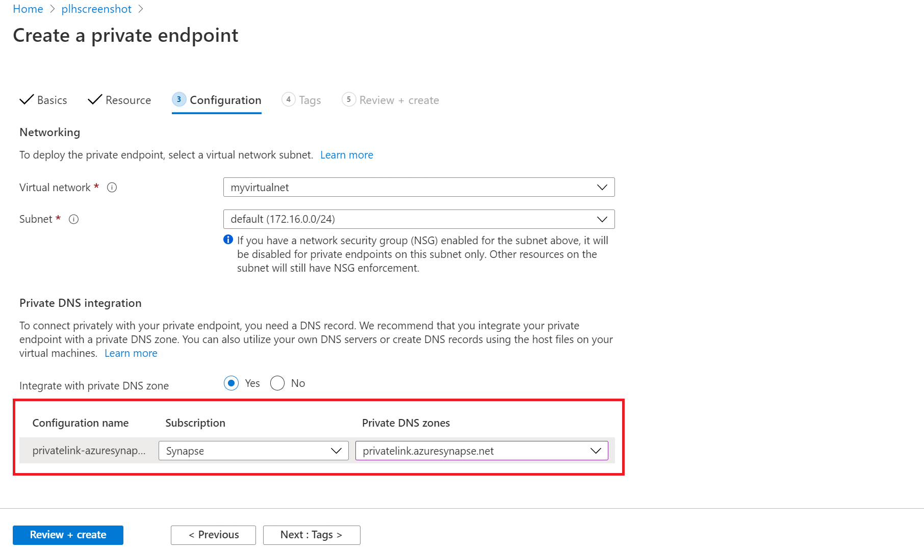 在“配置”选项卡上,在与虚拟网络和专用 DNS 区域集成时为专用 DNS 区域选择“privatelink.azuresynapse.net”。