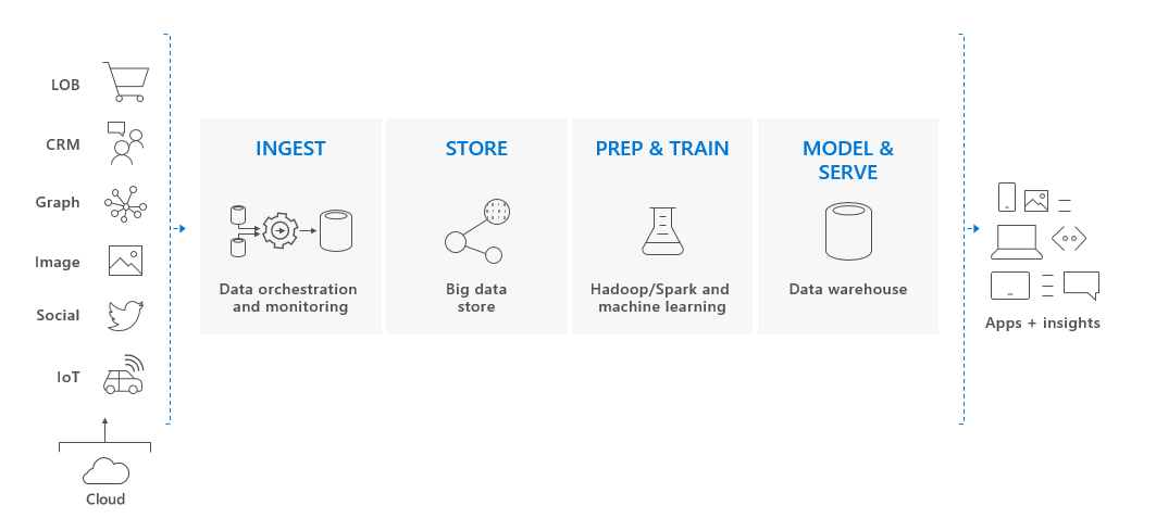 在云数据解决方案中,可从各种源将数据引入大数据存储中。 进入大数据存储后,Hadoop、Spark 和machine learning算法将准备和训练数据。 当数据可供进行复杂的分析时,专用 SQL 池就会使用 PolyBase 来查询大数据存储。 PolyBase 使用标准 T-SQL 查询将数据引入专用 SQL 池(之前称为 SQL DW)表中。