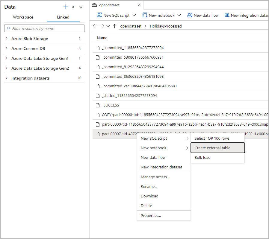 现在,使用 Synapse Studio 的 Data Lake 浏览功能,可以通过右键单击文件使用 Synapse SQL 池创建和查询外部表。 仅 Parquet 文件支持通过单击手势从 ADLS Gen2 存储帐户创建外部表。
