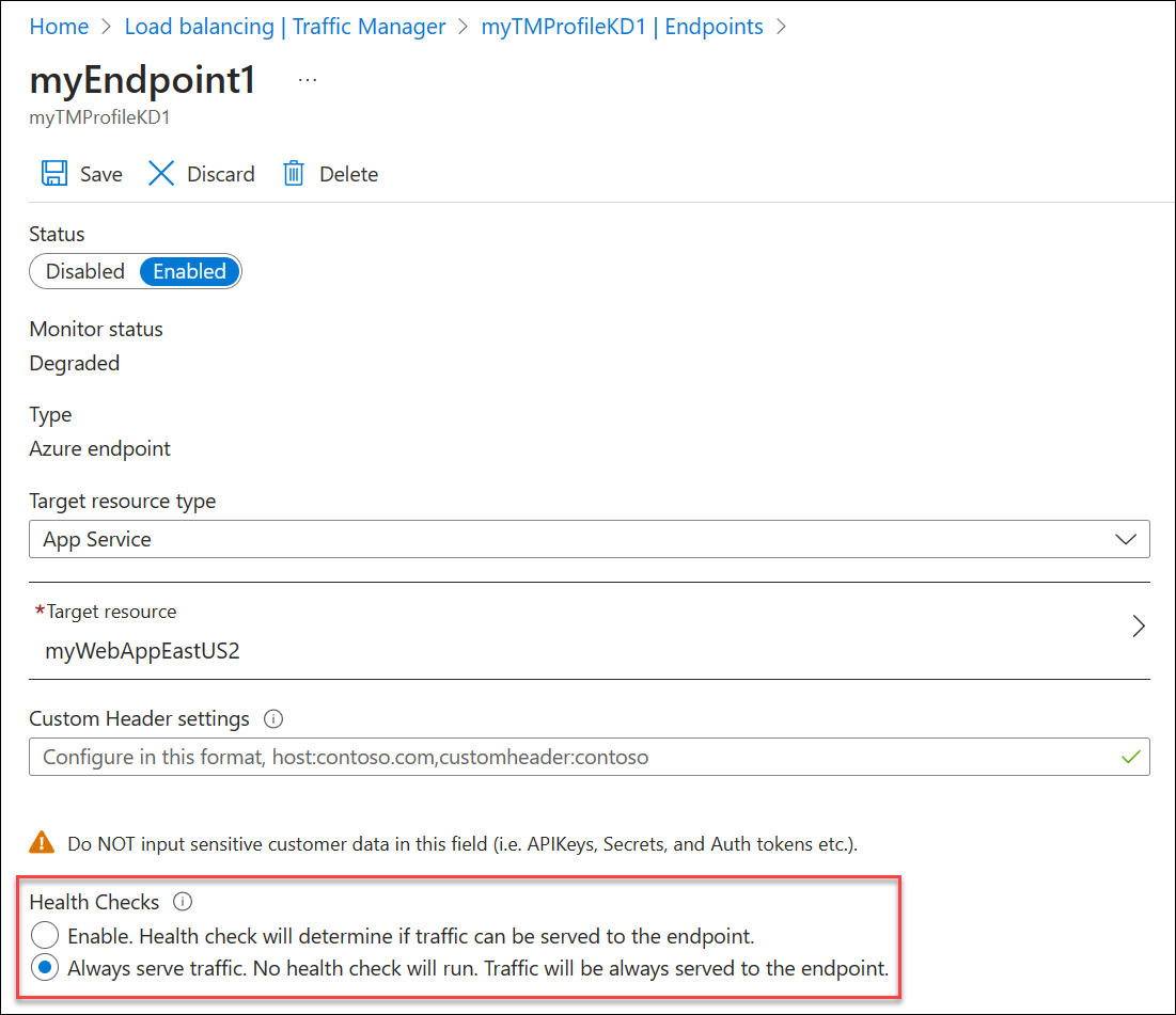 启用(运行状况检查)。 根据运行状况向终结点提供流量。 此设置是默认设置。