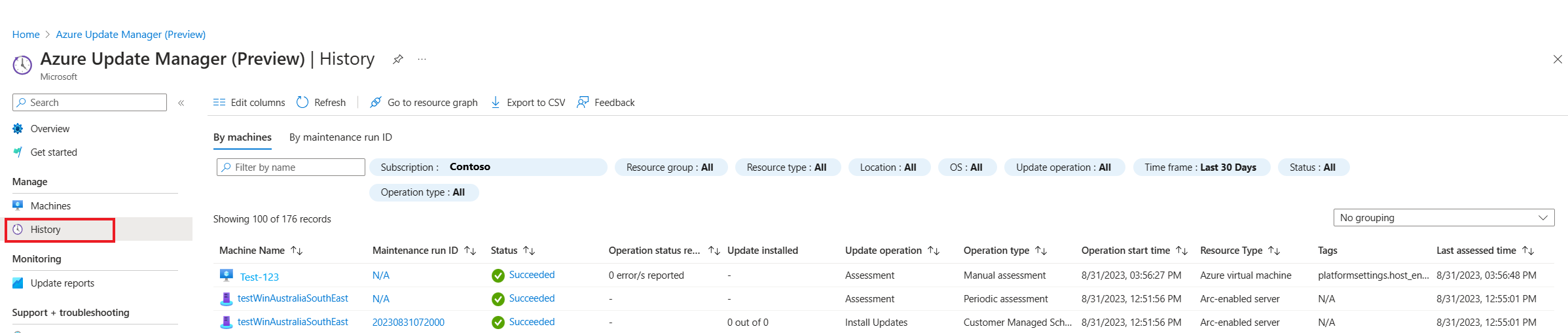 更新管理器使你能够在与更新管理器相关的 Azure 订阅中浏览有关 Azure VM 和已启用 Azure Arc 的服务器的信息。 可以筛选信息以了解多个计算机的更新评估和部署历史记录。 在“更新管理器”页中,从左侧菜单中选择“历史记录”。