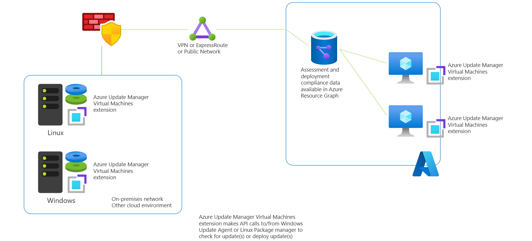 在 Azure VM 或已启用 Azure Arc 的服务器上启用或触发更新管理器作时,更新管理器会在计算机上安装 Azure 扩展 或 已启用 Azure Arc 的服务器扩展 (分别)来管理更新。