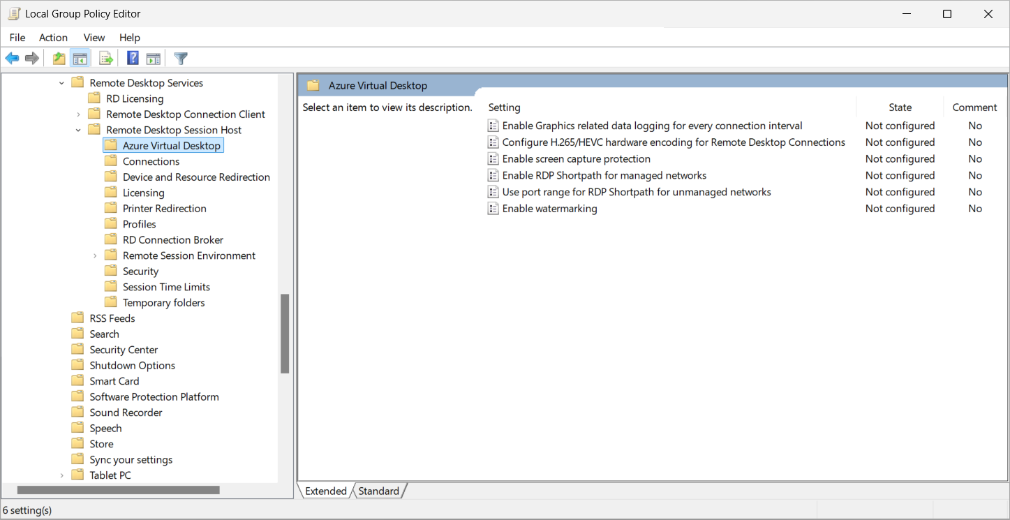 5. 对于使用 H.265/HEVC 的 GPU 加速远程帧编码,请浏览到设置选取器中的 管理模板>Windows 组件>远程桌面服务>远程桌面会话主机>Azure 虚拟桌面