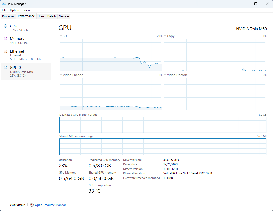 显示远程桌面会话中任务管理器中的 GPU 使用情况的屏幕截图。