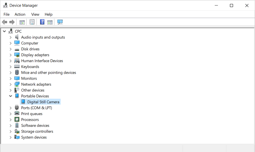 使用 MTP 和 PTP 重定向,iPhone 在“设备管理器”的“便携设备”下被列为应用程序的“数码静态相机”: