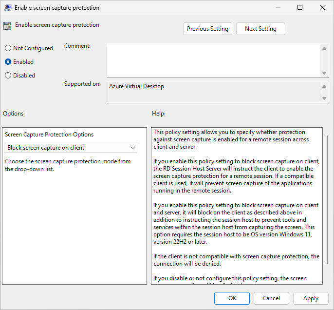 Windows和 macOS 设备:通过使用 Intune 设备配置策略或组策略配置会话主机来阻止屏幕捕获。 Windows App或Remote Desktop客户端无需进一步配置即可从会话主机强制实施屏幕捕获保护设置。