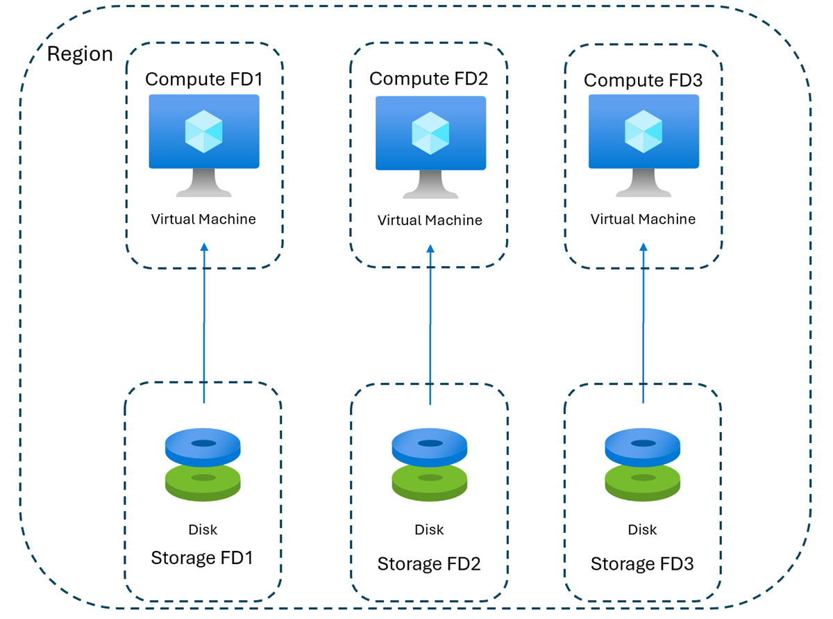 VM 也与磁盘容错域保持一致。 这种一致性可确保附加到 VM 的所有托管磁盘都在同一容错域内。