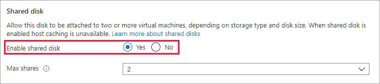 若要部署启用了共享磁盘功能的托管磁盘,请使用新属性 maxShares 并定义大于 1 的值。 这会使该磁盘可在多个 VM 之间共享。