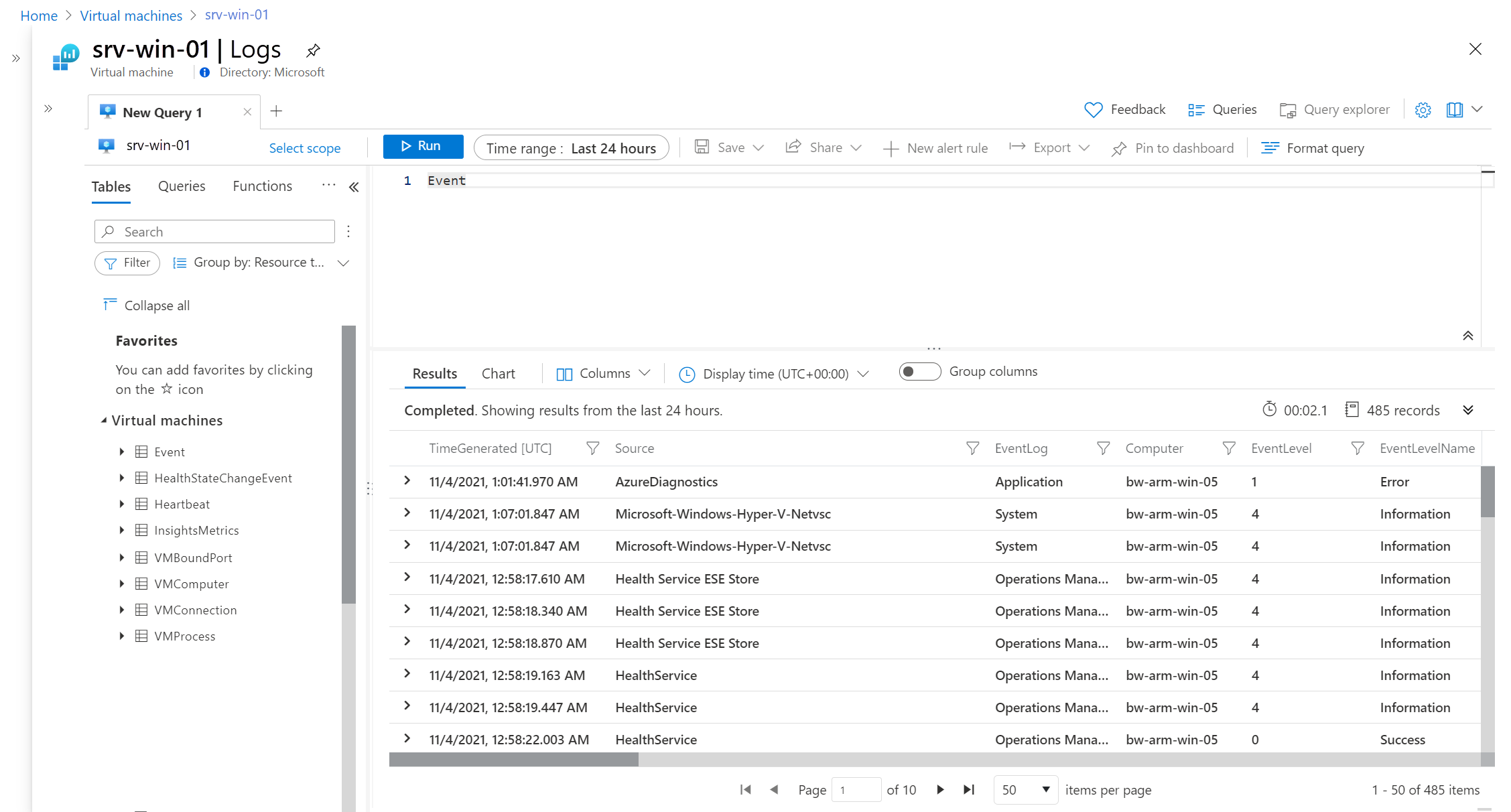 若要分析从 VM 中收集的日志数据,可以使用 Log Analytics 中的日志查询。 VM 的多个内置查询可供使用,你也可以创建自己的查询。 可以采用交互方式处理这些查询的结果,将它们包括在工作簿中以使其可供其他用户使用,或根据结果生成警报。