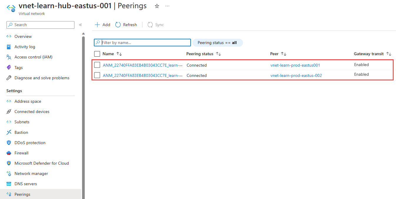 转到 vnet-learn-hub-eastus-001,然后选择设置下的对等互连,以列出由 Azure 虚拟网络管理器创建的虚拟网络对等互连。 其名称以“ANM_”开头。