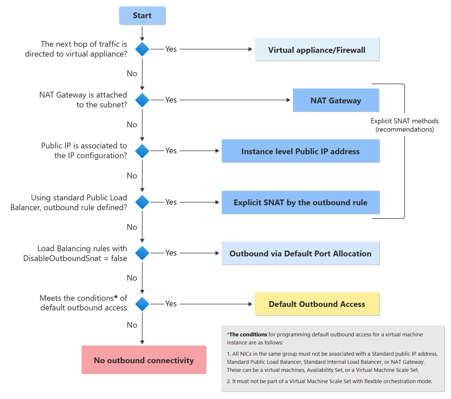 2026 年 3 月 31 日之后,新的虚拟网络将默认使用专用子网,这意味着必须启用显式出站方法才能访问 Internet 和Microsoft中的公共终结点。 有关详细信息,请参阅 官方公告。 建议使用以下部分中所述的显式连接形式之一。 有关其他问题,请参阅“常见问题解答:默认行为更改为专用子网”部分。