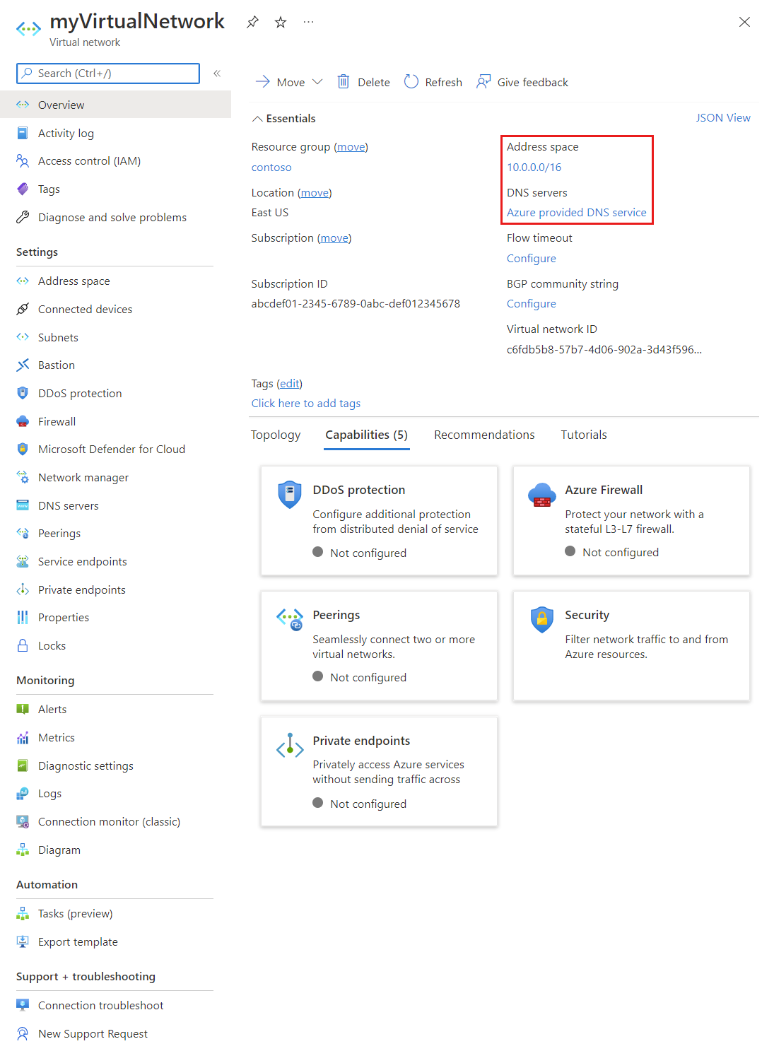 概览:提供有关虚拟网络的信息,包括地址空间和 DNS 服务器。 以下屏幕截图显示了名为 MyVNet 的虚拟网络的概述设置: