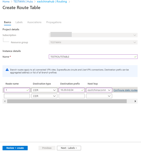 - 在“传播”页上,进行任何其他更改(如有必要),然后单击“创建”以使用新路由信息更新路由表。