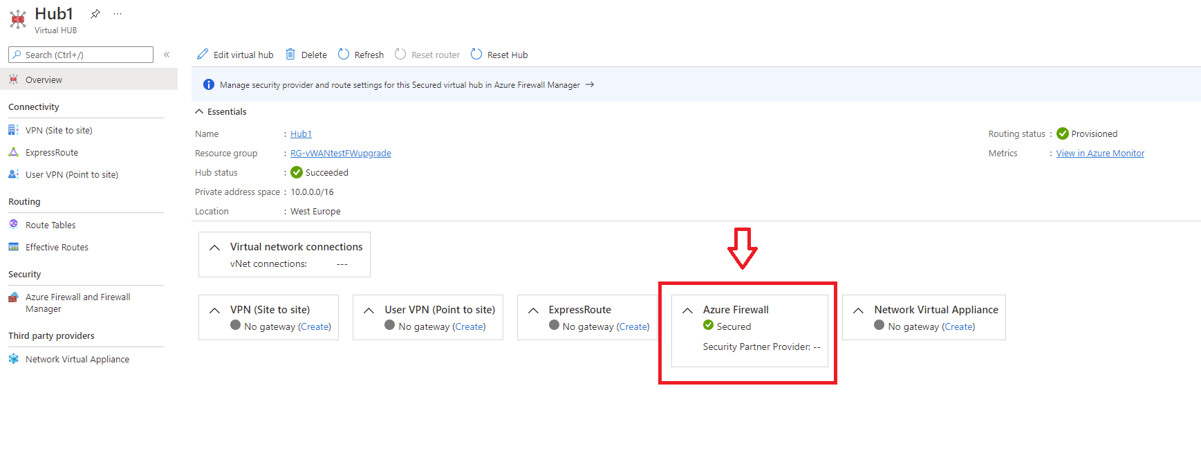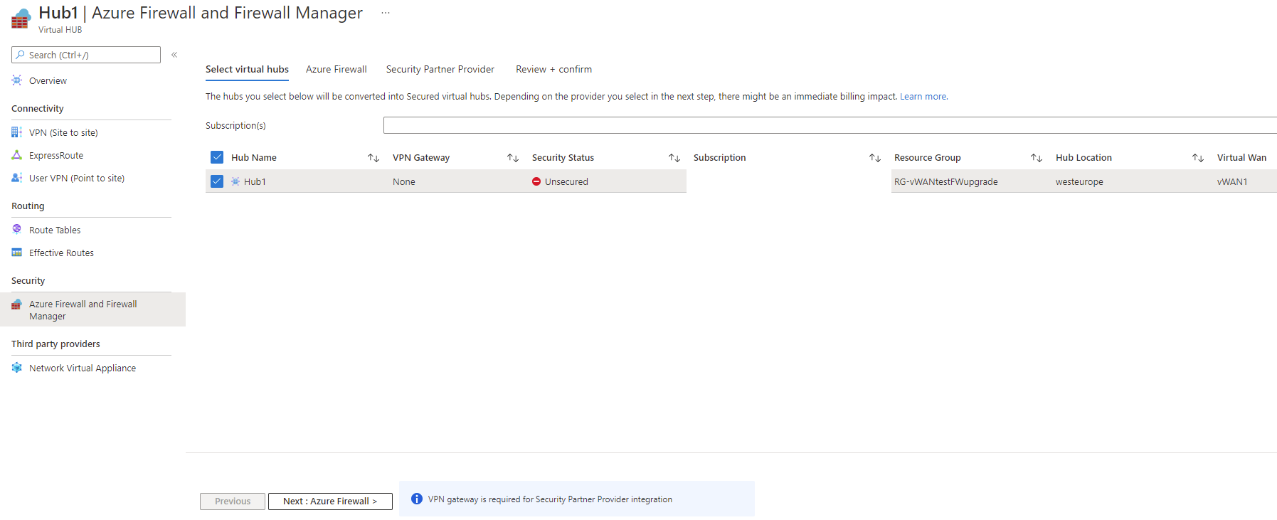 在虚拟 WAN 的“概述”页面上,选择要转换为安全中心的中心。