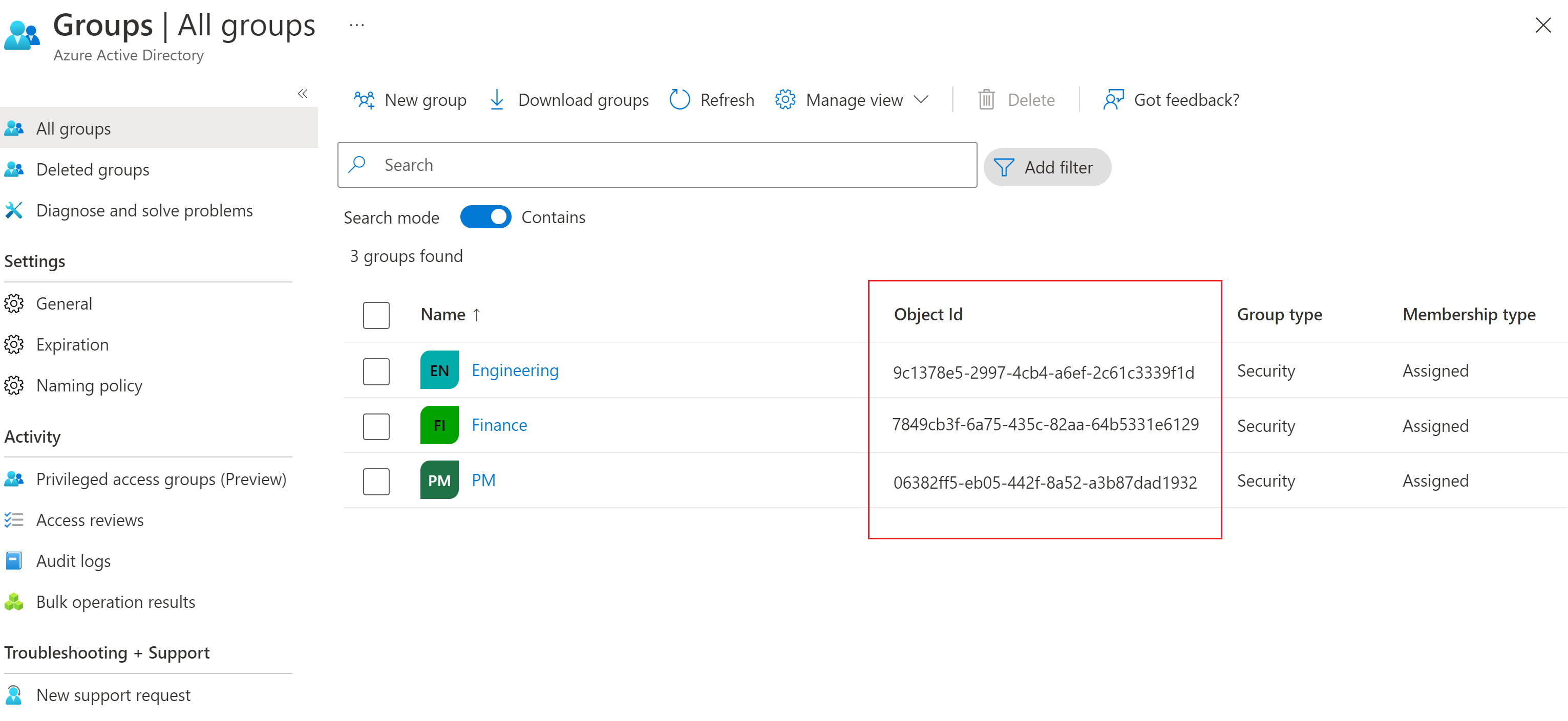 | 是 | 0 | 工程 | Microsoft Entra ID | groupObjectId1 |