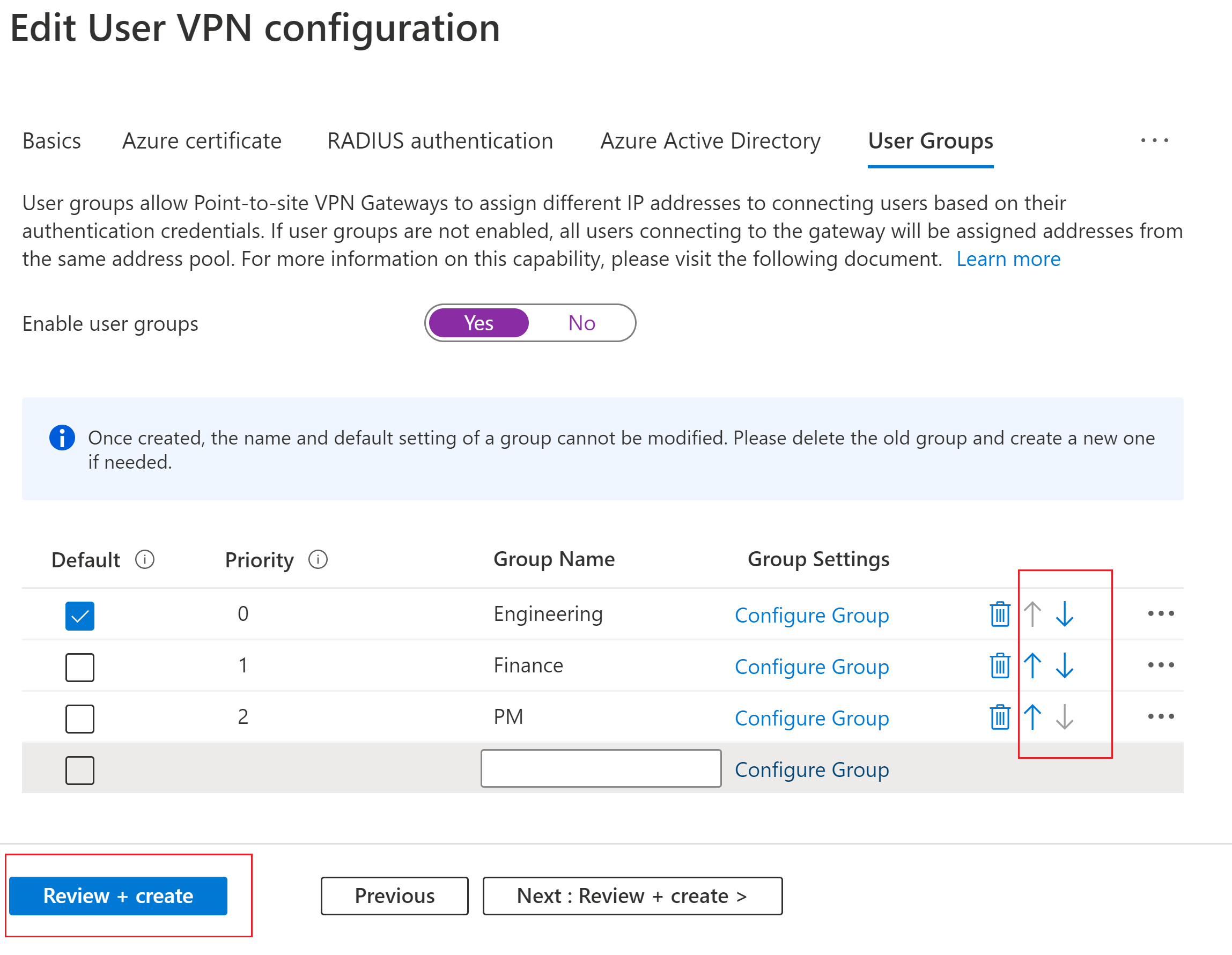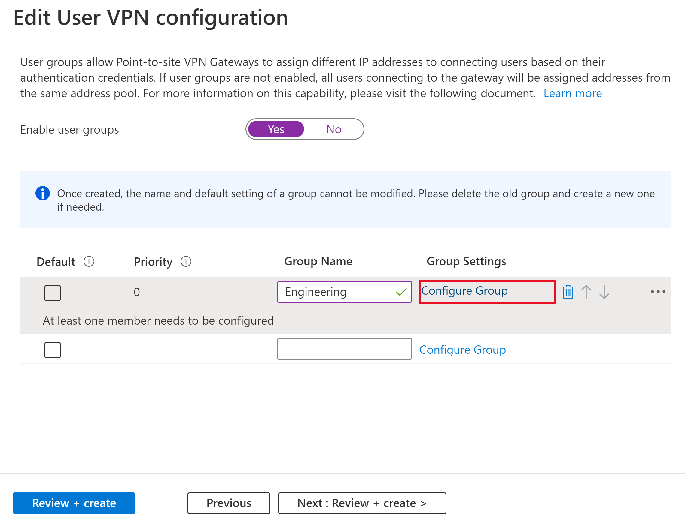 选择“查看 + 创建”以创建和配置。 创建用户 VPN 配置后,配置网关服务器配置设置以使用用户组功能。