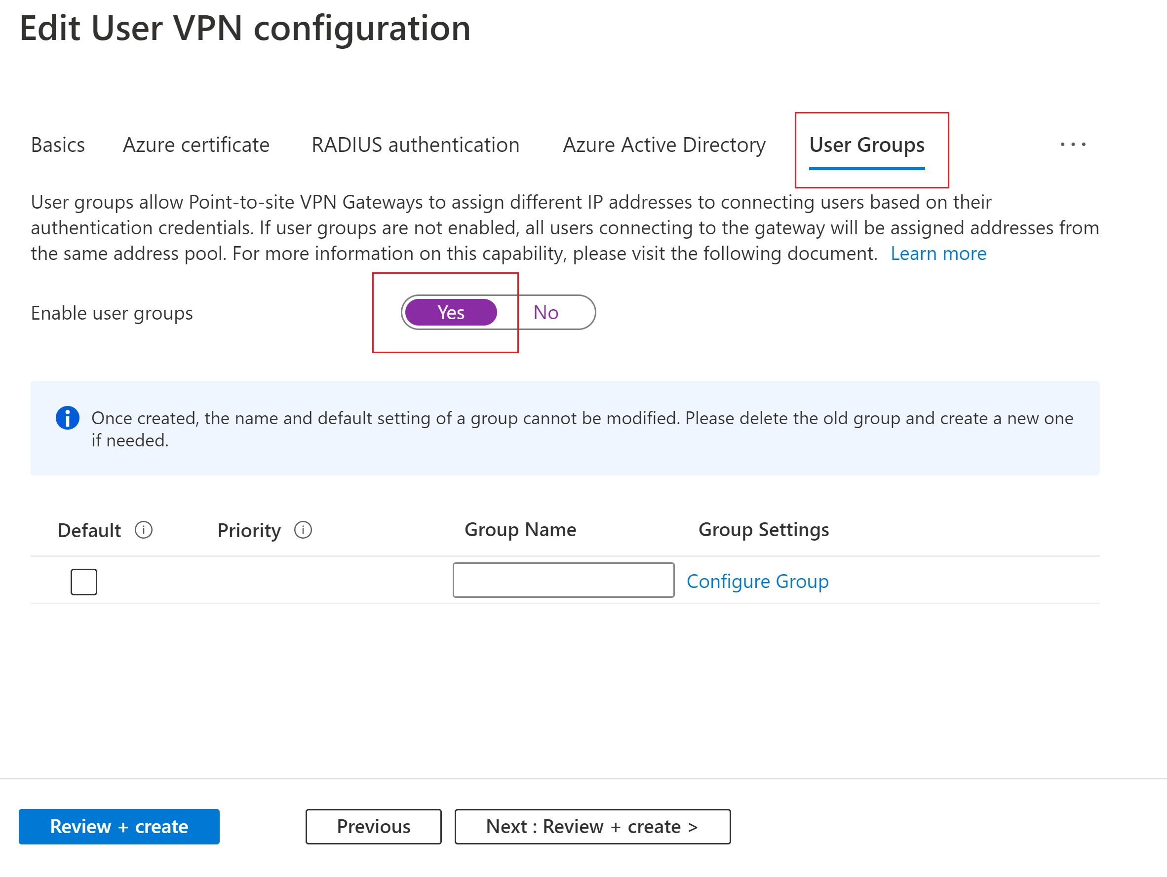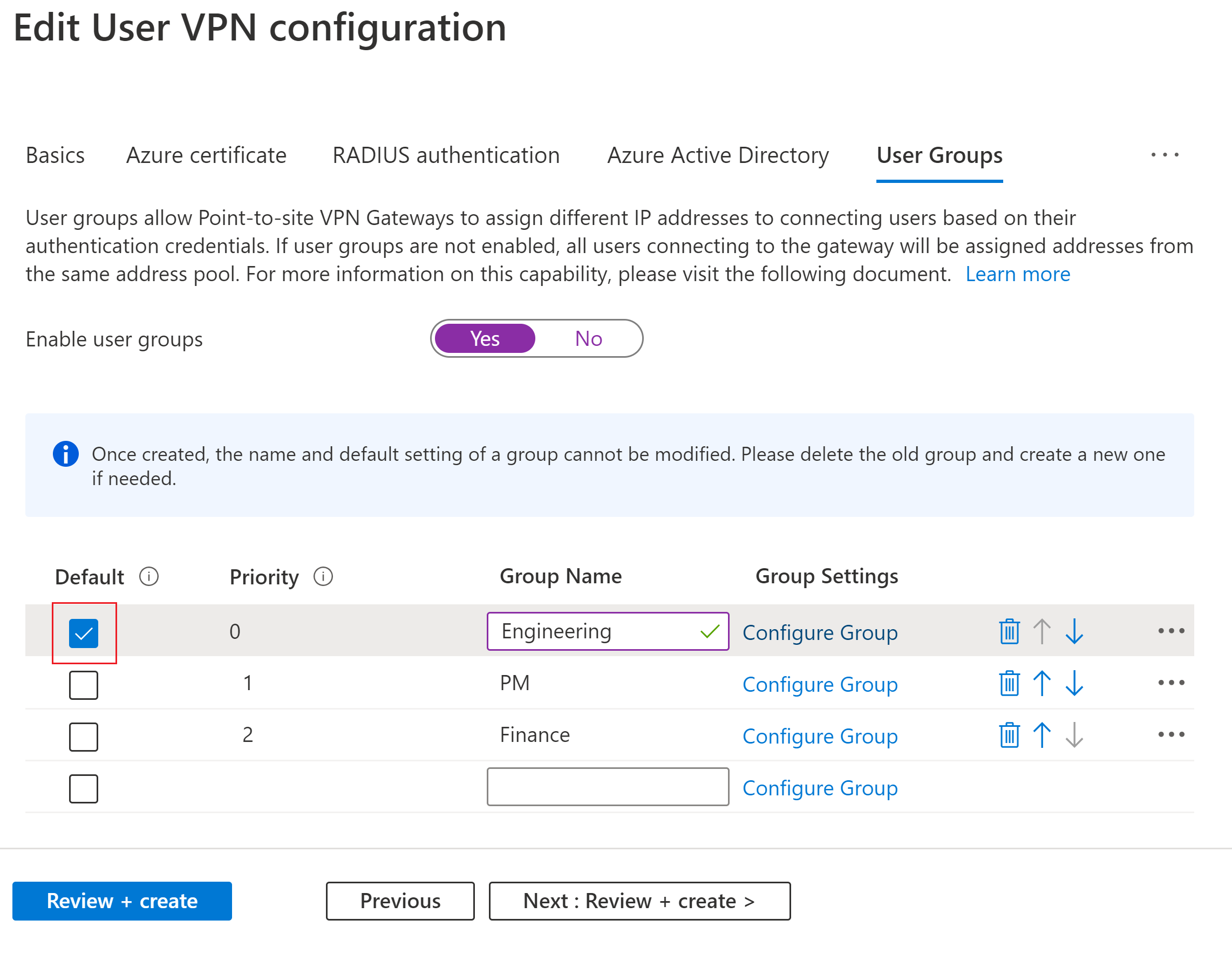 选择“是”以启用用户组。 将此服务器配置分配到 P2S VPN 网关时,将为属于相同用户组的用户分配相同地址池中的 IP 地址。 为属于不同组的用户分配不同组中的 IP 地址。 使用此功能时,必须为创建的组之一选择“默认”组。