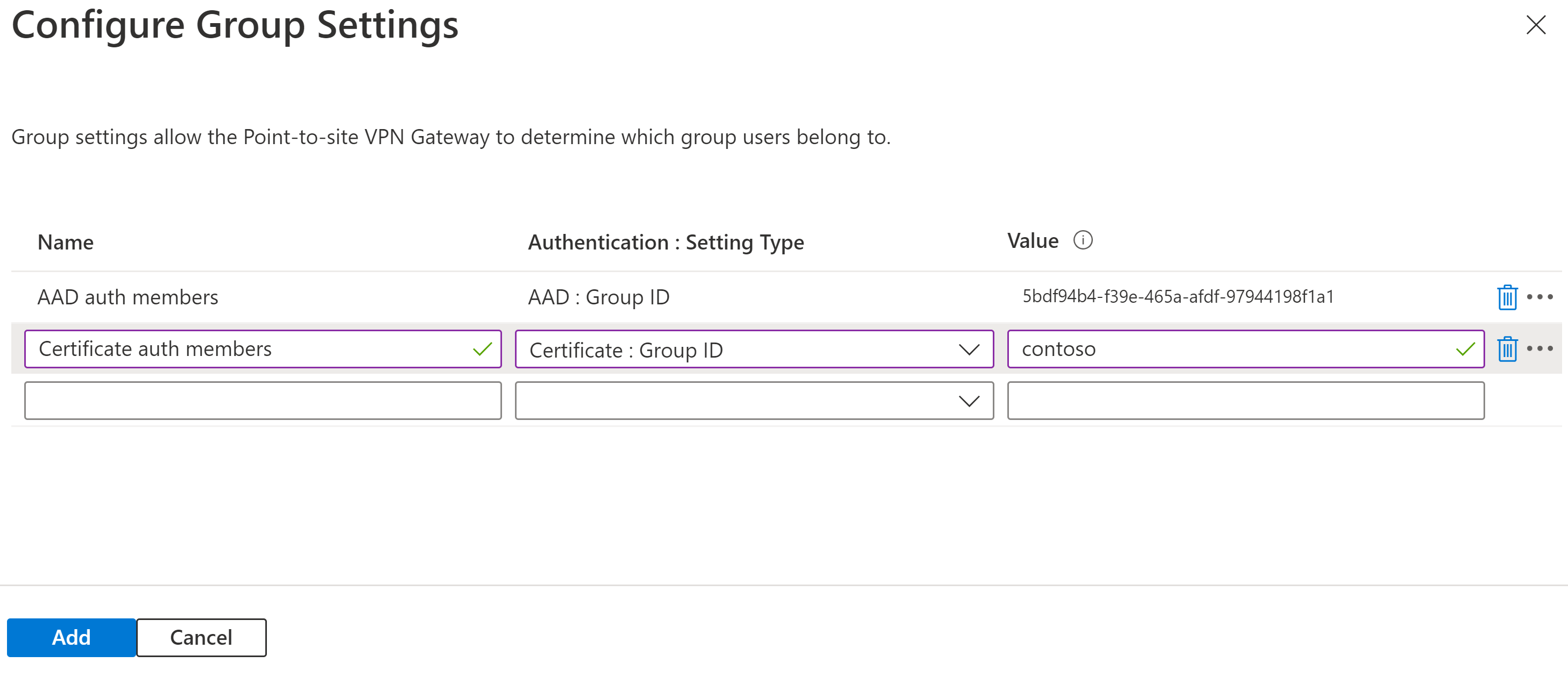 - 有关用户组的详细信息,请参阅关于 P2S 用户 VPN 的用户组和 IP 地址池。