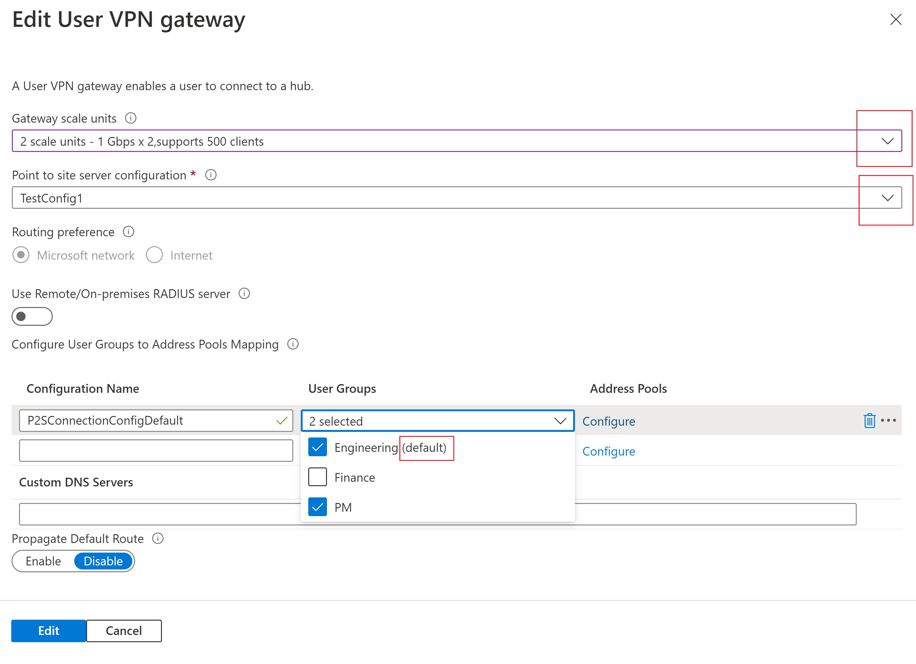 在“点到站点”页上,选择“网关缩放单元”链接打开“编辑用户 VPN 网关”。 在下拉列表中调整“网关缩放单元”值以确定网关吞吐量。