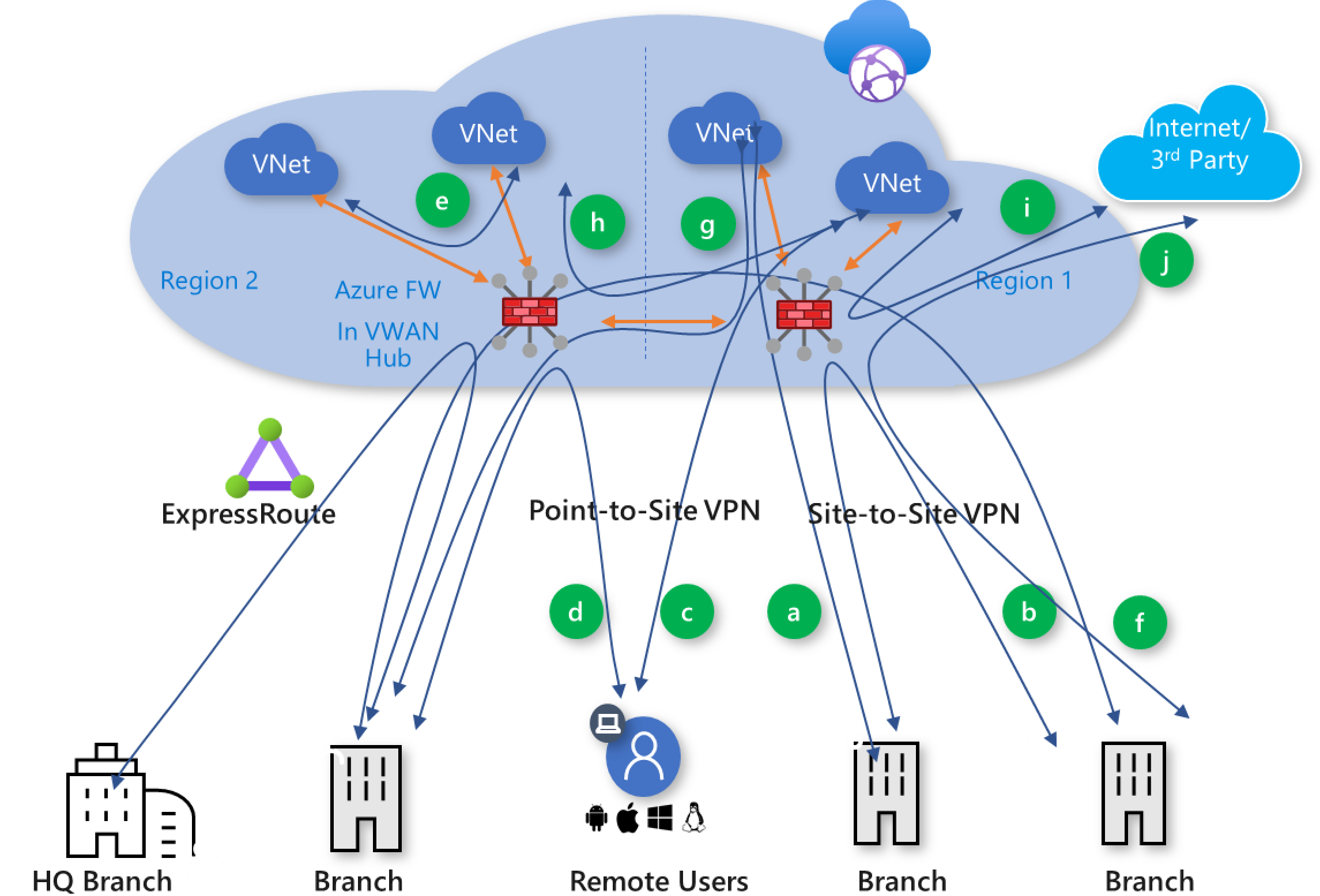 虚拟 WAN 支持以下全局安全传输连接路径。 虽然本部分中的关系图和流量模式描述了 Azure 防火墙用例,但中心部署的网络虚拟设备和 SaaS 安全解决方案也支持相同的流量模式。 括号中的字母映射到图 5。