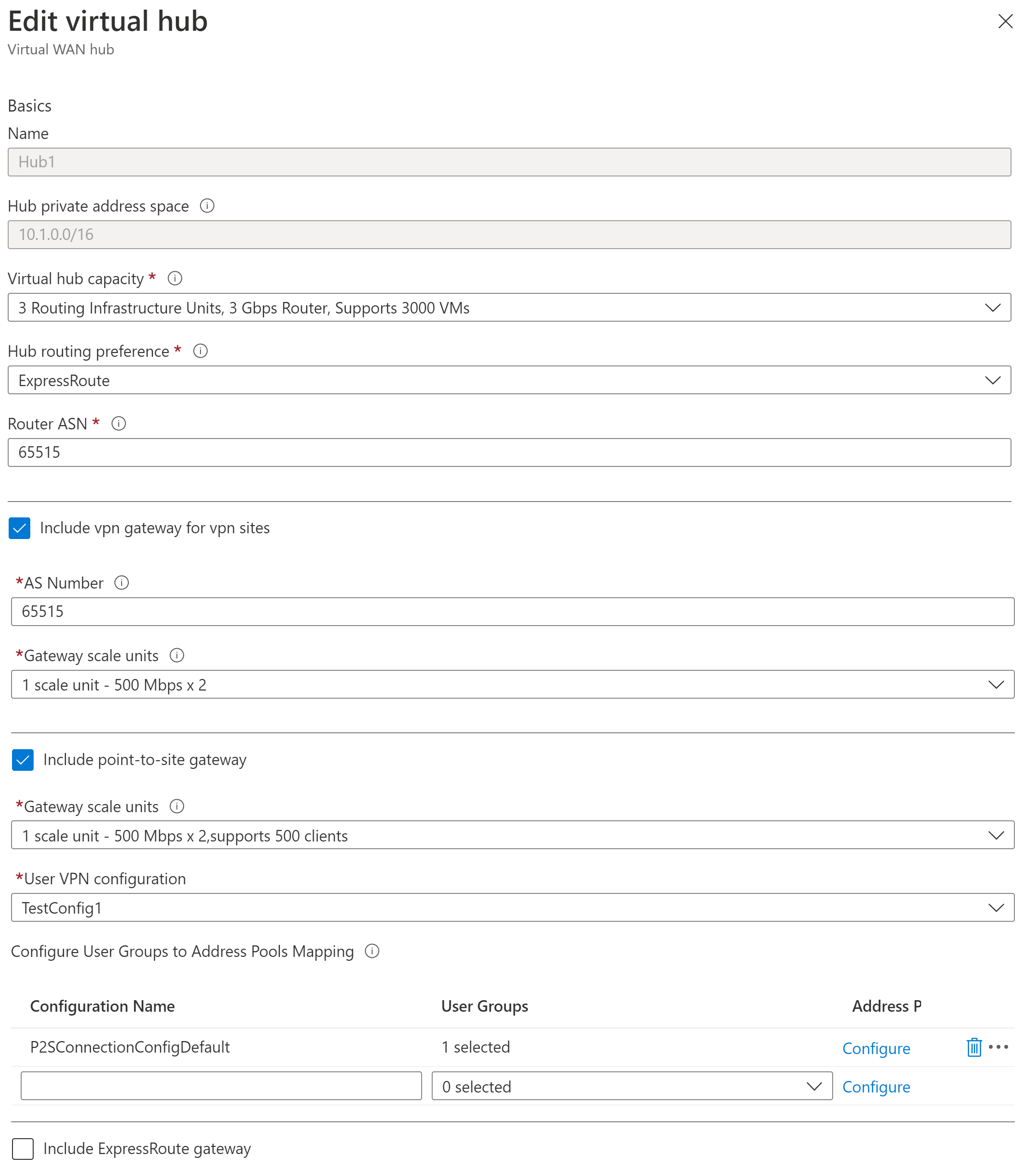 在“编辑虚拟中心”页上,选中“包含 VPN 站点的 VPN 网关”和“包含点到站点网关”的复选框以显示设置。 然后配置这些值。