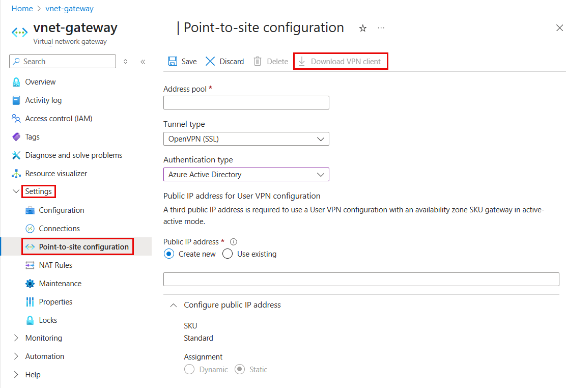若要查看公共 IP 地址 SKU,请转到 VPN 网关的 “属性” 页。 单击 IP 地址值以打开公共 IP 地址资源并查看资源 SKU。