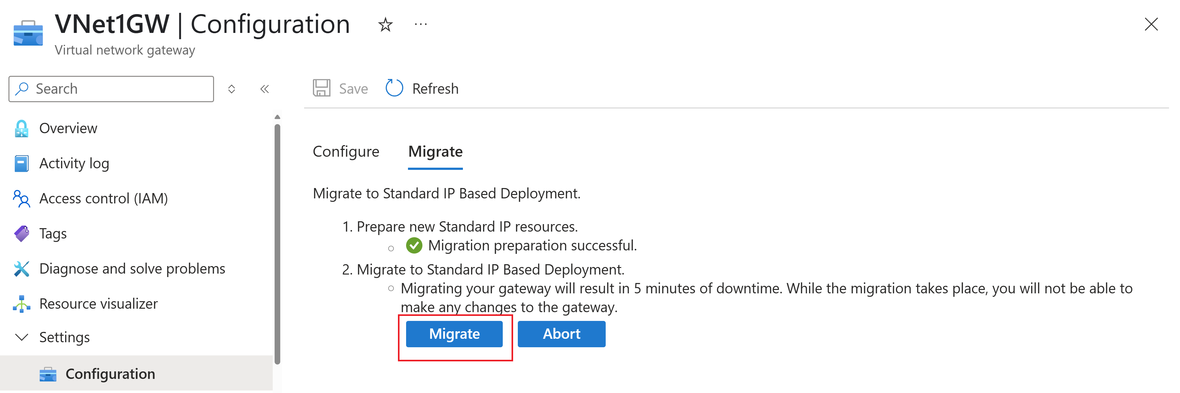 如果 VPN 网关 SKU 为 VpnGw 1-5,VPN 网关 SKU 会自动迁移到 AZ SKU(VpnGw 1-5 AZ),作为迁移过程的一部分。 在本部分中,你将验证迁移是否成功,以及流量是否按预期流动。 如果你发现网关不按预期工作,可以中止迁移以回滚所有迁移更改。