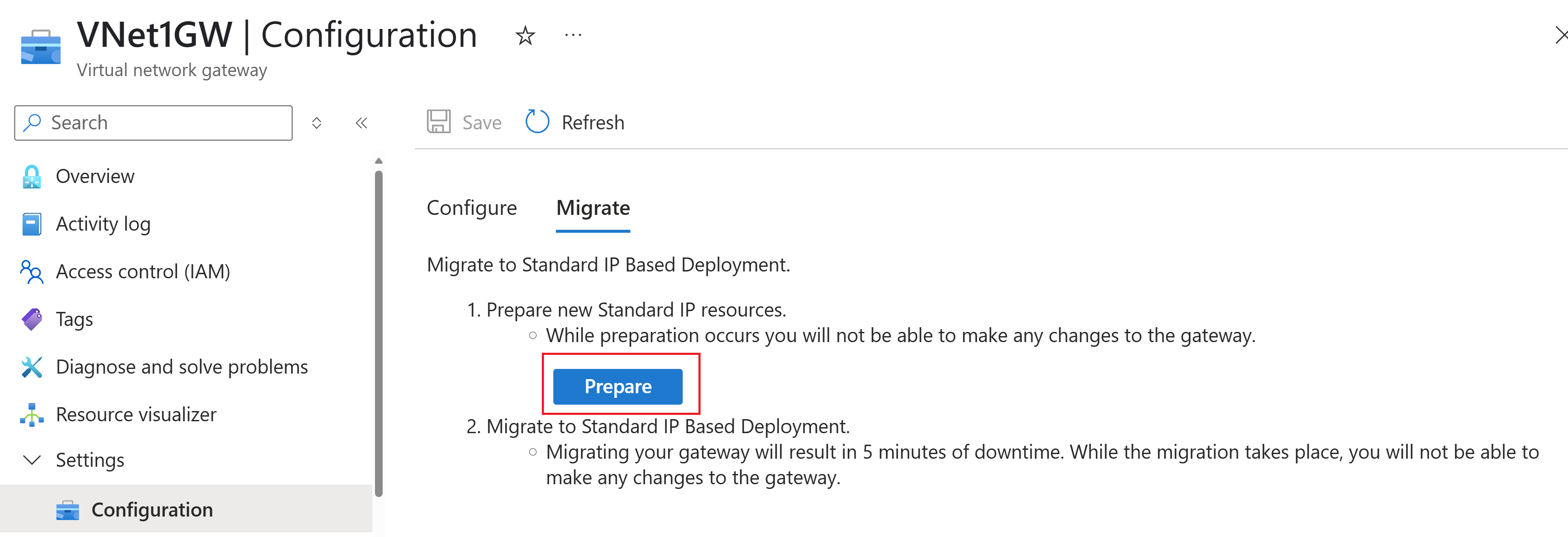 迁移功能正在向区域推出。 如果在 Azure 门户中未看到 “迁移 ”选项卡,则表示迁移过程尚未在你的区域中可用。 有关详细信息,请参阅 VPN 网关 - 新增 功能文章。