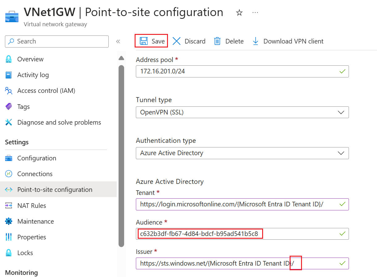 - 将 “受众 ”字段更新为新的“受众”值。 此值必须与此客户端连接到的 P2S 网关值匹配。
